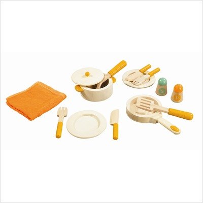 This is the perfect set of cookware to get your young chef cooking. The cookware, dinnerware and silverware are made of natural wood with orange water-based paint. Included are salt and pepper shakers that sound like the real thing, 2 knives, 2 forks, 1 pot with lid, 1 fry pan, 1 large ladle, 1 spatula, 2 dishes and a kitchen towel. It's a great addition to the Gourmet Chef Kitchen. The Hape brand has meant quality and innovation in toys for more than 30 years. It's the perfect kitchen starter set -- assembly is simple and all the tools and hardware needed are included.